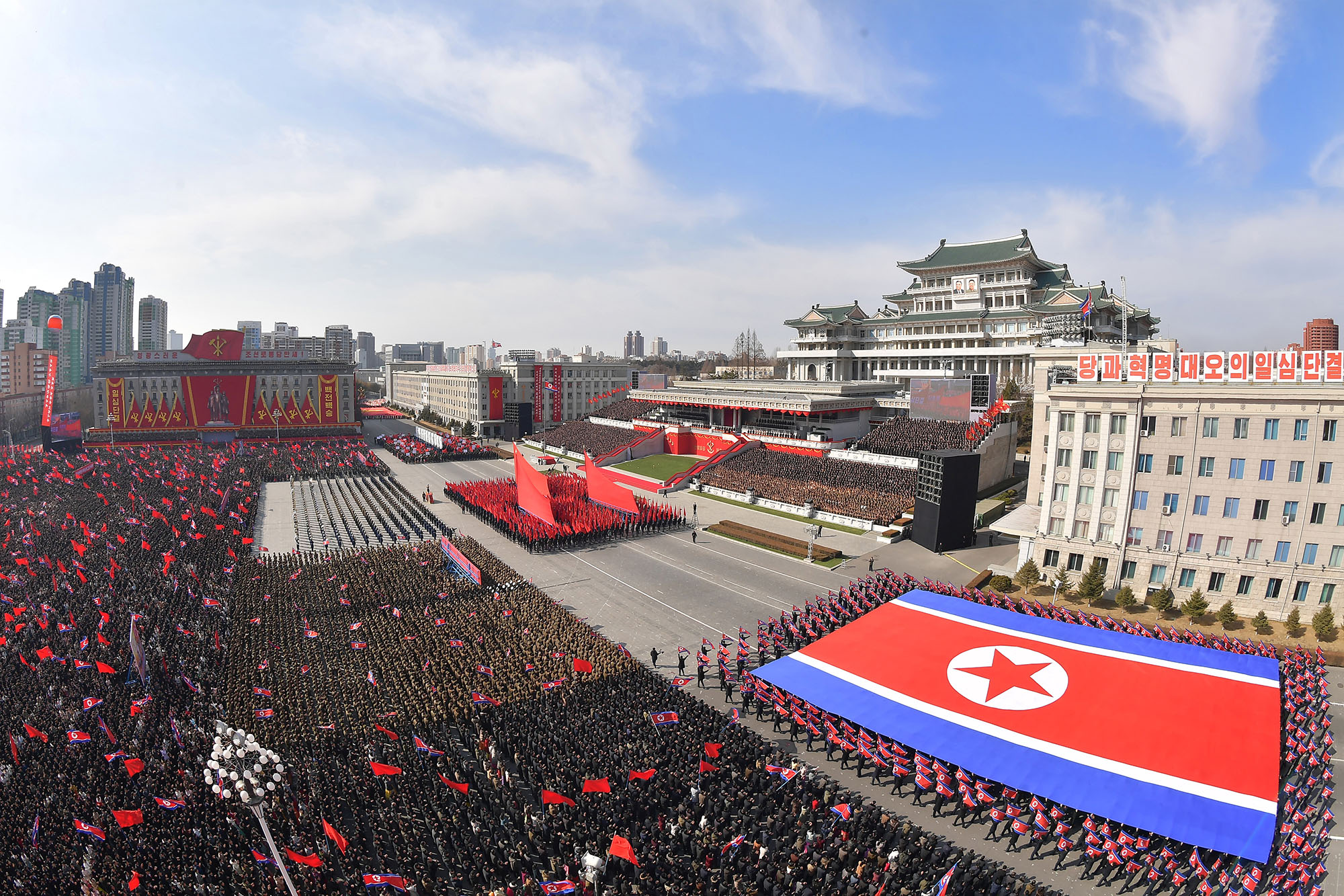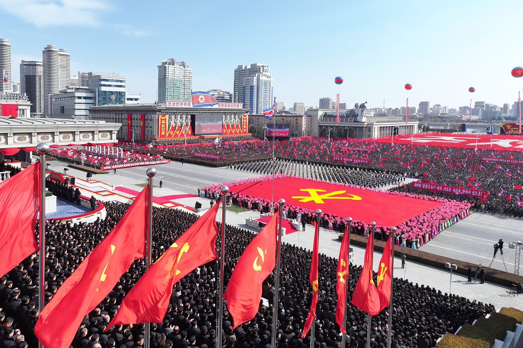 Huge crowds of people demonstrate their single-hearted unity in high spirits at a Pyongyang municipal military-civilian meeting and public procession held at Kim Il Sung Square in Pyongyang, the capital city of the DPRK, on Feb. 27.