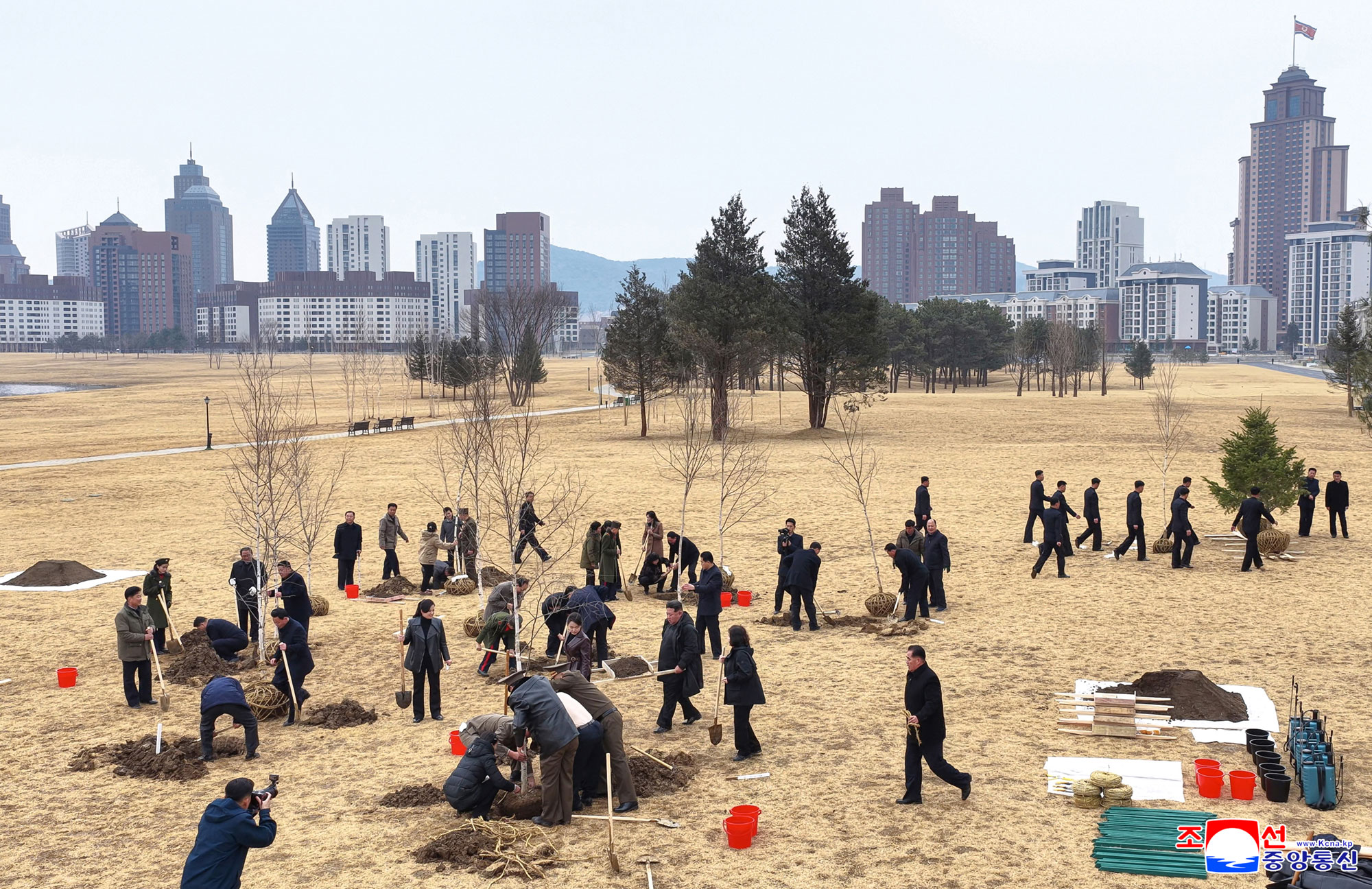 Kim Jong Un, general secretary of the Workers’ Party of Korea and president of the State Affairs of the Democratic People’s Republic of Korea, planted trees at the pondside park in Saeppyol Street on March 14, the tree-planting day.