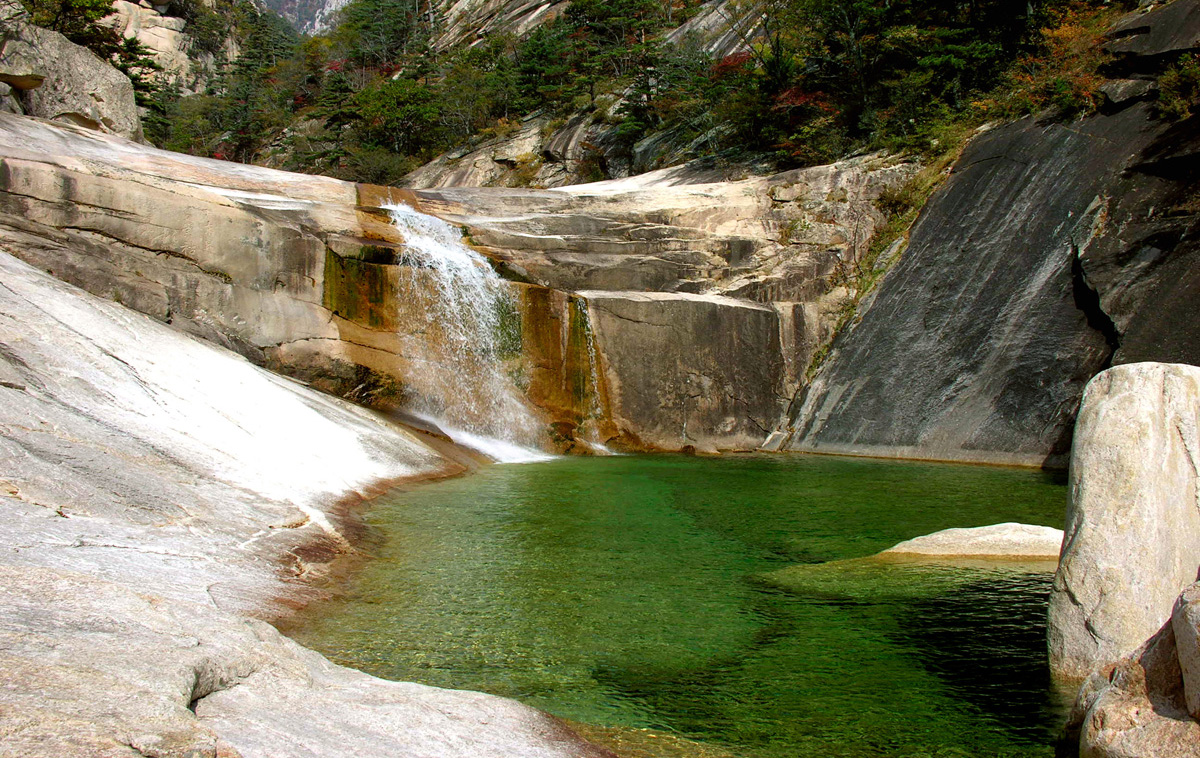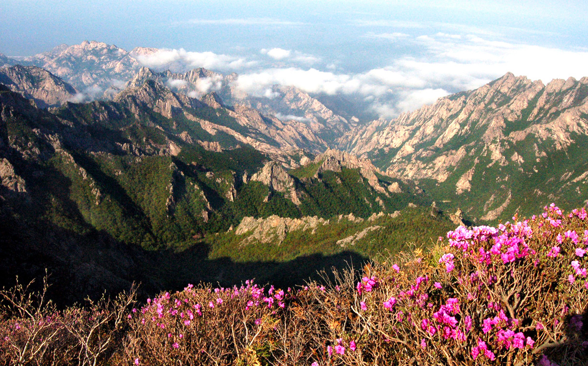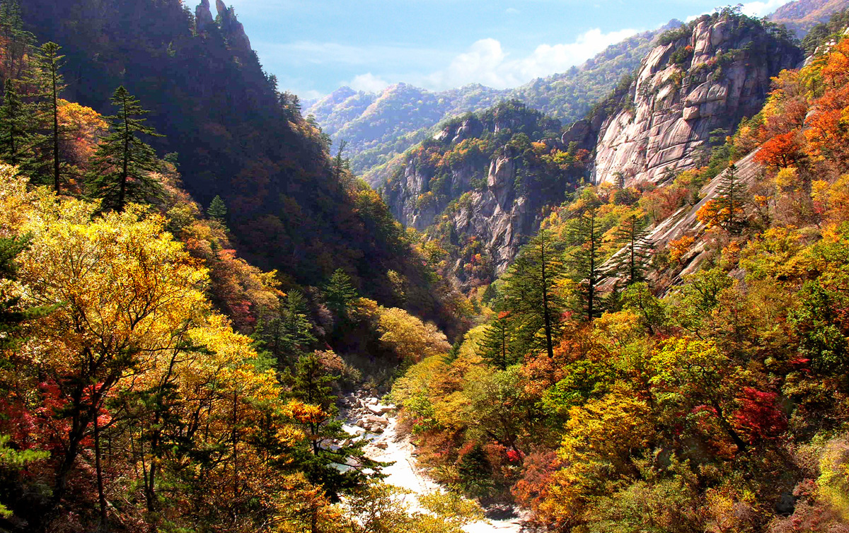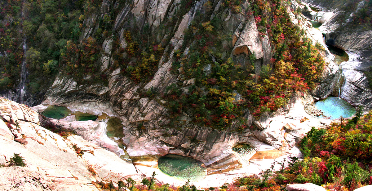 Mt Kumgang a celebrated mountain in the DPRK, presents spectacular natural scenery with gigantic cliffs, deep valleys and many pools blending well with green foliage.